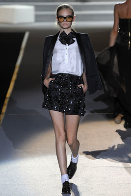 DSquared2 goes geek for its spring 2011 collection, showcasing looks with round oversize glasses and pairing boat shoes with ankle socks. In addition to the quirky outing, designers Dan and Dean Caten included a dose of elegance with floor length gowns and menswear inspired tuxedos to close the show.